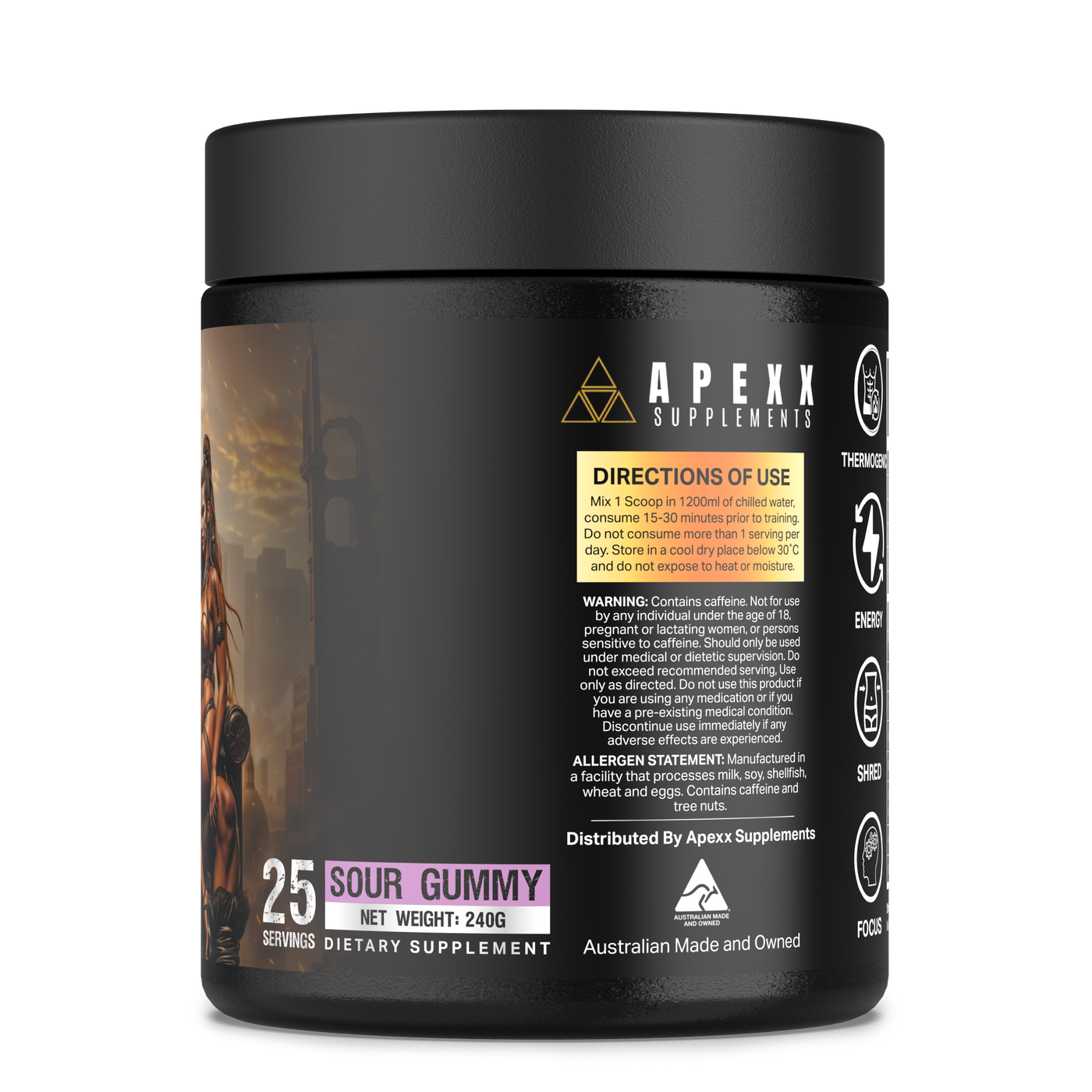Forge the body of a true warrior. APEXX Warrior is a high-powered thermogenic designed to torch fat, amplify energy, and sharpen focus. With ingredients that stoke your metabolism and keep you battle-ready all day, it’s the ultimate weapon for anyone serious about getting lean and staying relentless. Each tub packs 30 powerful servings to fuel your transformation. Step into the fire, embrace the burn, and conquer your journey with APEXX Warrior.