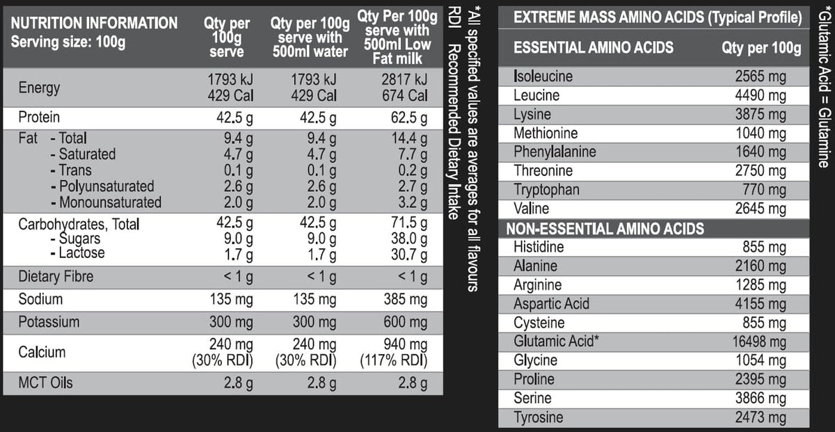 International Protein Extreme Mass Chocolate Truffle Flavour Weight Gainer Protein Powder is a dangerously anabolic weight gainer protein powder. It has been formulated as a powerful mass gainer supplement to help you increase your muscle size. It tastes incredible and is perfect in a pre-workout shake or as an on-the-go calorie boost. The nutrient-rich formulation features five types of protein, including whey peptides, WPI, WPC, micellar casein and egg albumen. Extreme mass is a dangerously anabolic weight gainer protein, designed for serious mass gainers. This mass gainer includes 5 types of protein as well as a unique selection of complex carbohydrates and a healthy blend of canola and sunflower oils combined with fast-burning MCT Oils. It puts the emphasis on ensuring the body maintains a highly anabolic state to maximise extreme mass and size gains. It is a genuine energy-rich high-calorie weight gainer, not just a carbohydrate-heavy formulation that is passed off as a mass gainer. To facilitate lean mass gain, the body needs extra calories. While carbs (carbohydrates) can offer you a muscle-sparing energy source, they still only provide the same energy as protein. Delivers a higher concentration of energy than protein and carbs to make it easier to consume the calories required for optimum nutrition that promotes lean weight gain. Hydrolysed Whey Protein Isolate (Whey Peptides). High Glycomacropeptide Whey Protein Isolate (WPI). Whey Protein Concentrate (WPC). Micellar Casein (Milk Protein Isolate). Egg albumens. Grass-fed whey has been shown to be far more nutritious than other types, containing an increased amount of vitamin E and omega-3 fatty acids.