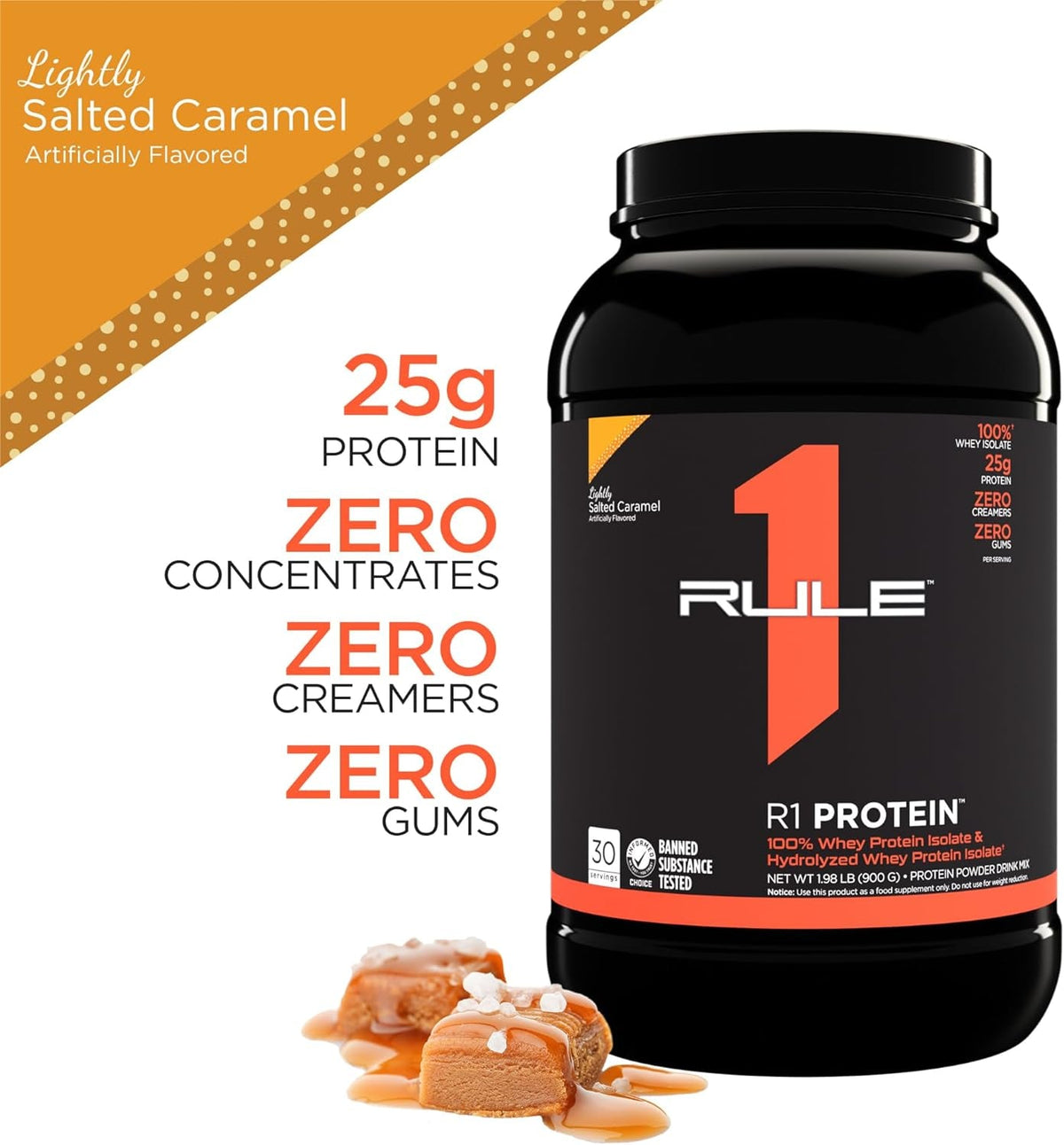 R1 100% Whey Protein Isolate and Hydrolysate Pre-Workout Protein Powder is super-pure 100 percent whey isolate and fast-acting whey hydrolysate, while completely omitting the use of whey concentrates, creamers, gums and other fillers, we’re left with an industry leading Protein Purity Percentage (PPP) of up to 87 percent. Gram for gram, R1 Protein has more fast-acting whey protein per unit of volume period. Our fast-acting combination of whey isolate and hydrolyzed whey isolate (and virtually nothing else) supports muscle repair and recovery. This protein formula is as pure as it gets. With 25g of protein and over 6g of BCAAs entirely from intact and hydrolyzed whey protein isolates R1 Protein helps support the recovery and growth aspirations of the most ardant muscle builders. With 100 percent of protein from whey isolates and hydrolysate isolates. 6g+ BCAAs.Amino acids are naturally occurring and approximated. Weights are rounded to the nearest pound. Product sizing and servings per container vary slightly between flavors. R1 Protein provides essential amino building blocks to support muscle recovery any time, but is most effective when consumed immediately after workouts. This lightly salted caramel flavour protein powder can be try around workouts, between meals or in the evenings before going to sleep.